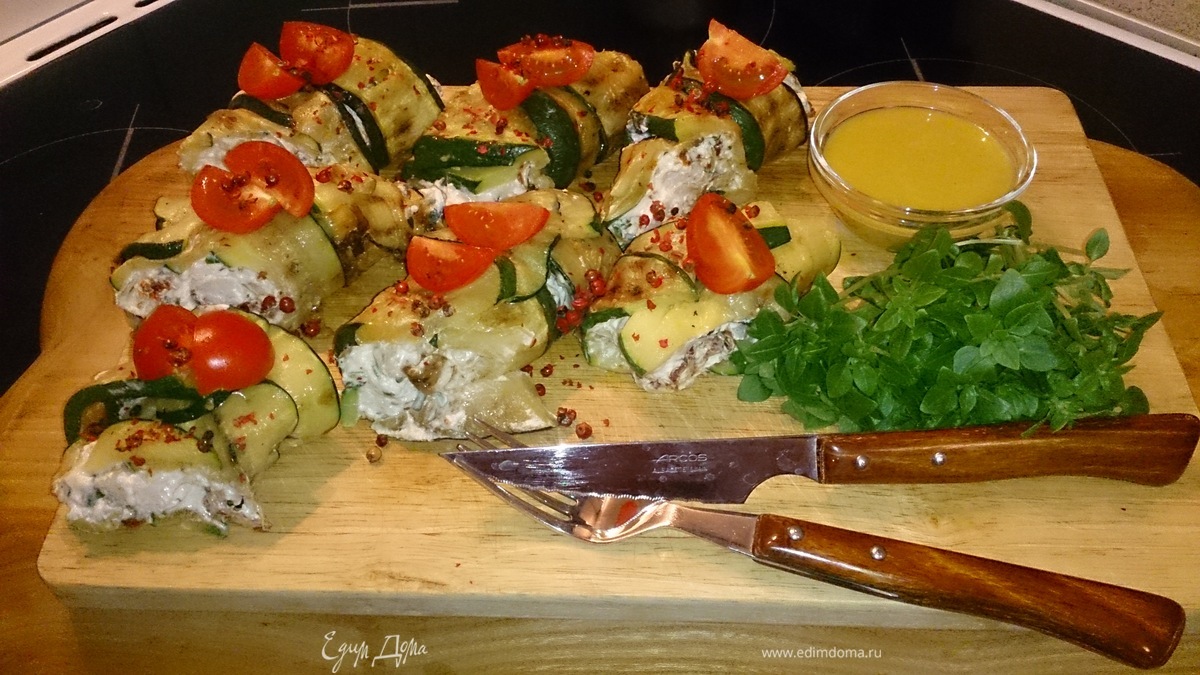 Выкладываем полоски цукини внахлест и выкладываем сверху начинку. - Шаг 9
