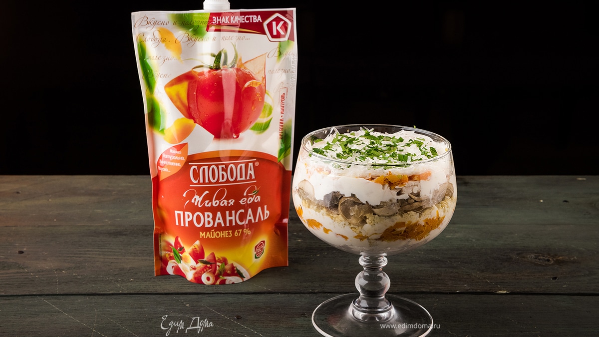 Выкладываем морковь с чесноком, яйца, грибы, лук. Все слои промазываем майонезом. - Шаг 8