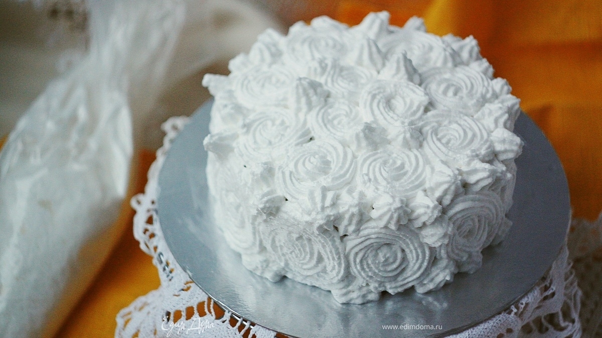 Собираем торт. Остывший бисквит разрезаем вдоль на три части (у меня была форма 16 см, у вас может быть больше или меньше и, следовательно, частей может получиться меньше или больше). Каждый корж поливаем сиропом и собираем их в башенку, прослаивая лимонным заварным кремом. Верх также покрываем этим кремом и смазываем торт по бокам. Затем украшаем белковым кремом, закрывая всю поверхность торта, можно просто смазать, а можно сделать узоры или такие розочки, как у меня. Затем ставим торт в холодильник на 1 — 2 часа, чтобы белковый крем чуть схватился, и можно кушать.