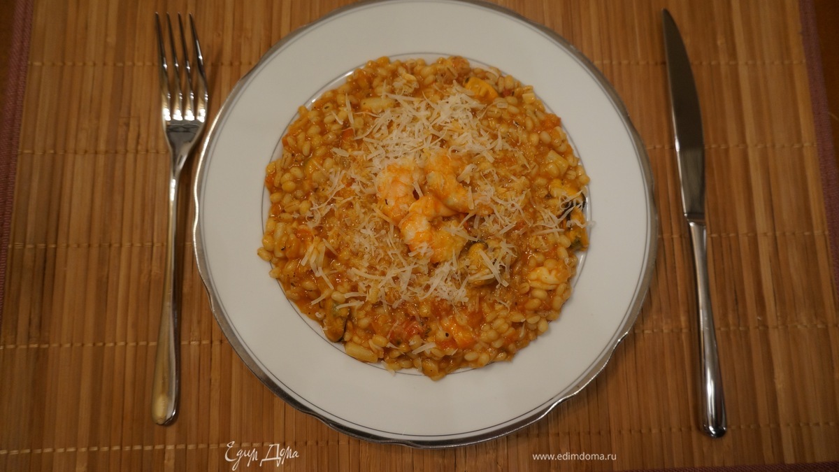 - Перловая крупа, креветки, мидии, томаты, кальмары, белое вино, пармезан