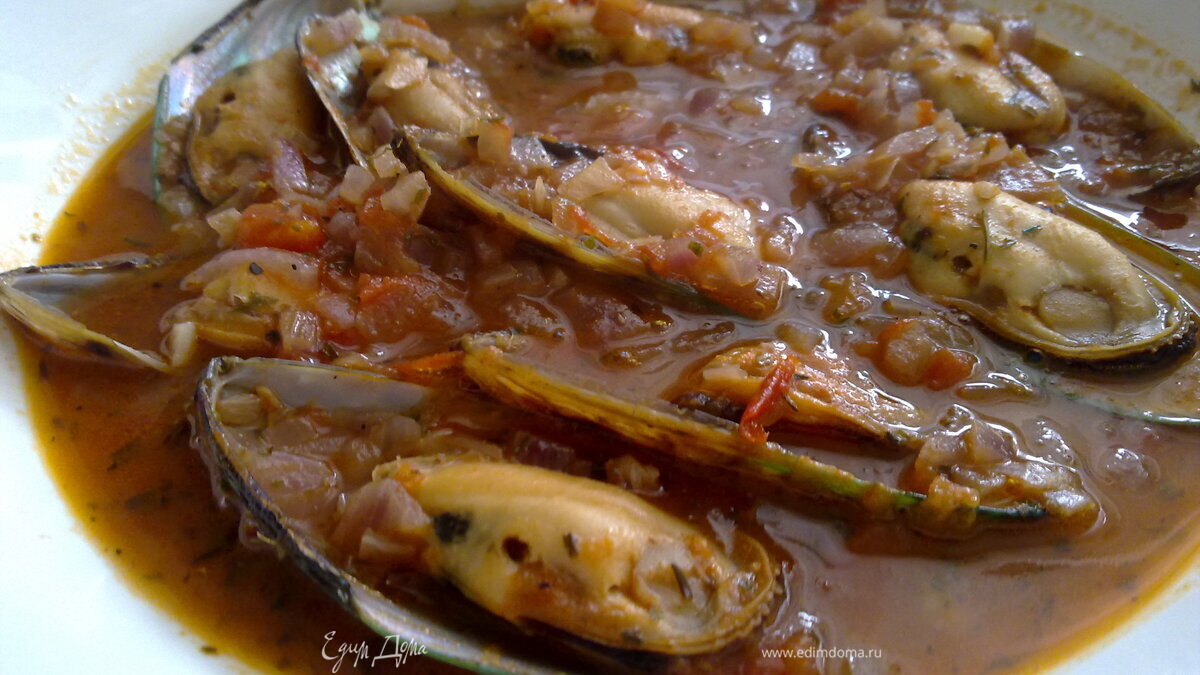 - Шаг 1У меня не было свежих ракушек с мидиями, и я купила упаковку мороженых мидий в ракушках, Новая Зеландия. В Москве они продаются в супермаркетах типа «Седьмой континет» и «Азбука вкуса». Получается тоже хорошо. Для, Москвы, впрочем, актуально. 1. Перчик чили очистить от семян и мелко нарезать, мелко порезать шалот и чеснок. И все вместе обжарить до румяности на оливковом масле в глубокой емкости. 2. Добавить бланшированные и порезанные кубиками помидоры (или из упаковки Pomito). Тушить помидоры с луком и чесноком на среднем огне 7-10 мин. 3. Добавить вино, тимьян, поперчить, посолить, с выложить в полученный бульон мидии.Можно чуть-чуть разбавить водой. Варить ещё 10 минут.Если мидии свежие, то выбросить нераскрывшиеся ракушки!!! В самом конце добавить мелко порезанные петрушку и базилик. 4. Подавать в супнице или глубоких мисках с поджаренными на гриле ломтиками белого хлеба (очень вкусно макать в суп) и холодным белым вином.