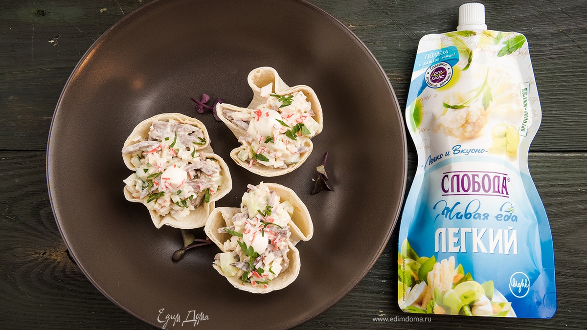 Выложить салат порционно в готовые корзинки.