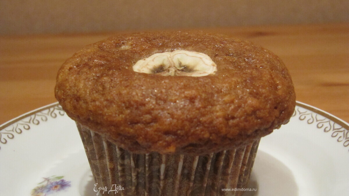 Оставшуюся половинку банана порезать на кружочки и уложить их сверху по центру каждого маффина. Отправляем маффины в предварительно разогретую до 180°С духовку на 20 — 25 минут. - Шаг 9
