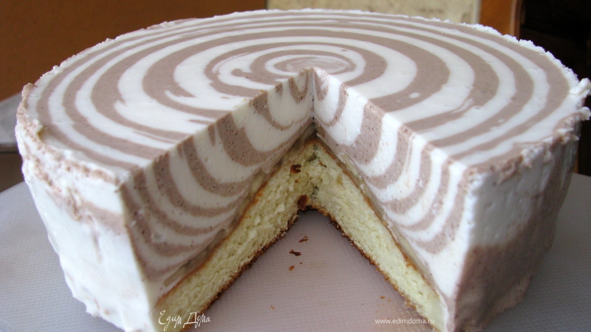 - Шаг 1творог смешать со сметаной,сахарной пудрой,ванильным сахаром. растворяем желатин в 400 г теплой воды(по инструкции) Соединить с творожной массой. на дно разъёмной формы выкладываем готовый бисквитный корж,примять его. на корж выкладываем ломтики банана. делим нашу массу пополам: в одну добавляем кофе(или/и какао для цвета) затем,по=очереди точно в серединку по 4 ст.ложки выкладываем массу то белую,то тёмную... Убираем на холод на 2-3 часа.