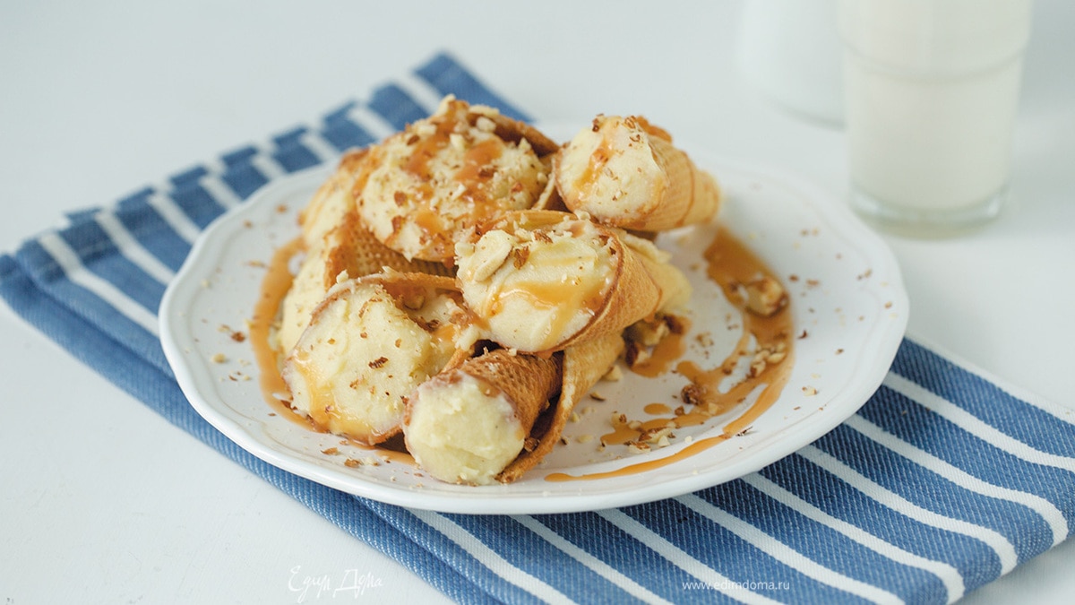 - Шаг 5Горячие вафли, не остужая, свернуть в трубочки и наполнить кремом.