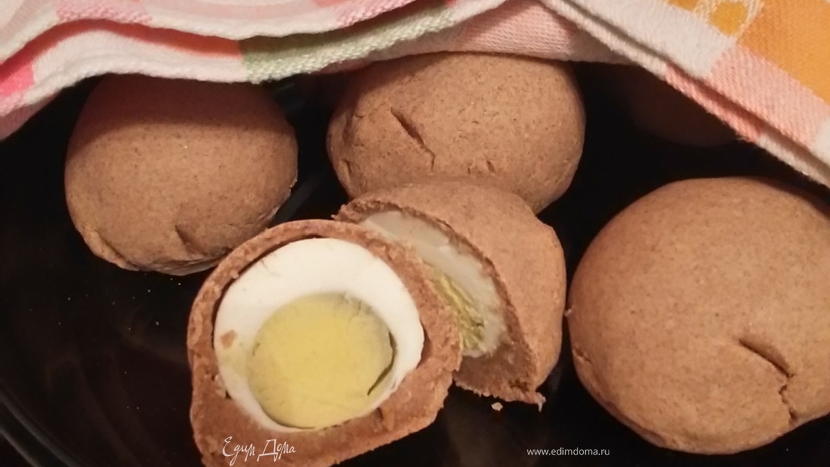 Разделить тесто на 6 частей. Каждую часть раскатайте в тонкую лепешку. На середину лепешки положите яйцо и заверните в тесто. - Шаг 3