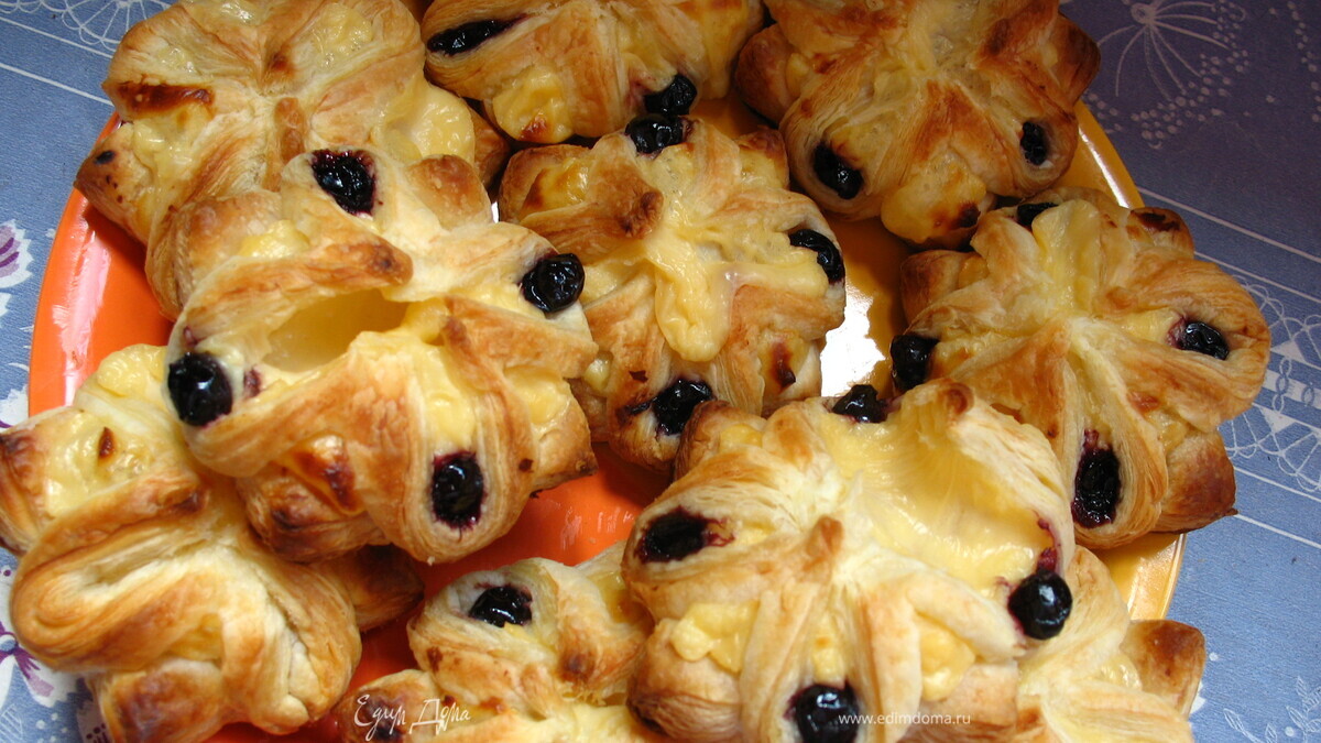 - Шаг 1Тесто разморозить. Пока оно размораживается займемся кремом) Молоко вскипятить с сахаром 50 гр и ванилином, а желтки отдельно растереть с оставшимся сахаром и крахмалом чтоб не было комочков.В мисочку с желтками медленно влить молоко только так чтоб они не сварились)) при этом постоянно помешивать. Потом желтковую массу медленно вылить в кипящее молоко. На медленном огне довести до загустения. Не забываем не прерывно мешать, чтобы масса получилось ровной, без комочков, и не подгорела.Когда наш крем остыл можно формировать слоечки. Порезать тесто на квадраты или как кому нравится положить начинку и сформировать слоечки.... Выпекать при температуре 200 градусов где то минут 20. Потом украсить на свое усмотрение я свои черешенками украсила перед тем как ставить в духовку.Или можно пудрой припудрить.