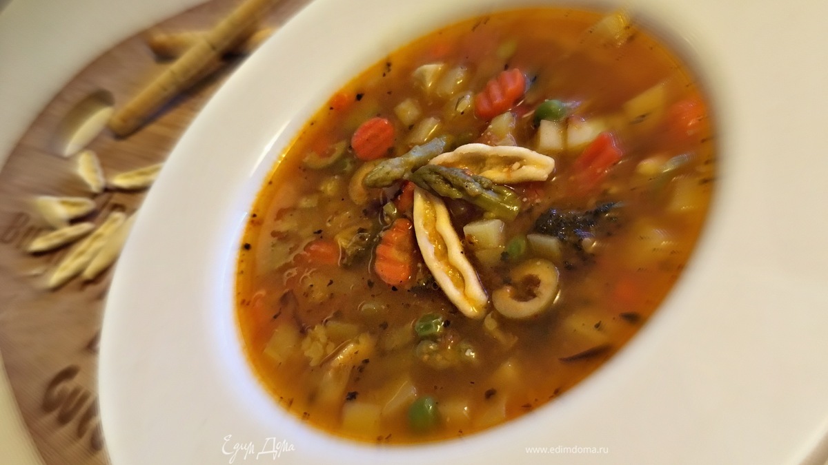 Минестроне, что в переводе означает «большой суп», — традиционный итальянский суп. Такой домашний, сытный и густой, для любого времени года. Разнообразие овощей делает его полезным и питательным. Подойдет вегетарианцам и в пост. Подавать можно с брускеттой, фокаччей, итальянскими хлебными палочками и песто.