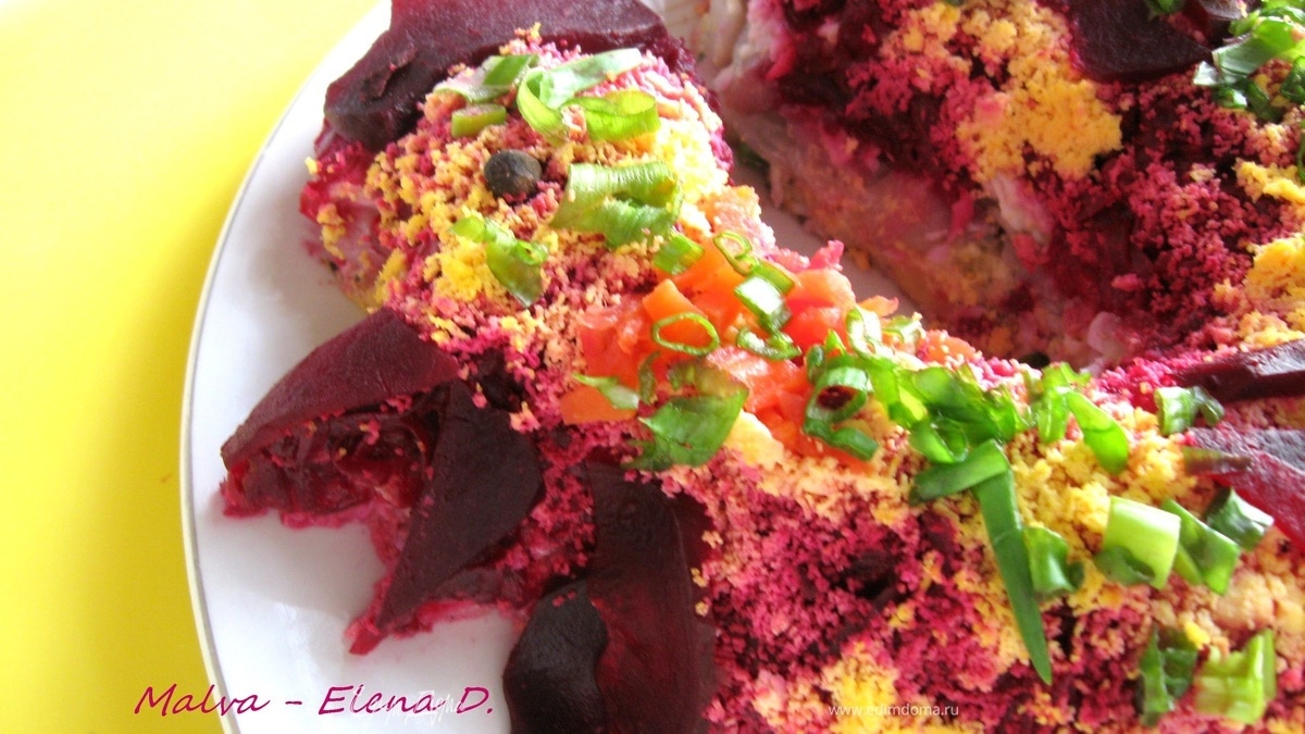 Украсить пластинками свеклы, моркови, желтком, мелко нарезанным зеленым луком. Счастливых праздников и приятного аппетита!
