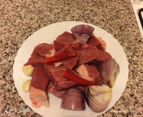 Мясо, лук, чеснок и перец пропустить через мясорубку. В фарш добавить соль, черный перец, воду и хорошо вымесить.