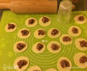 Тесто разделить на 3 части. Раскатать 1 часть, вырезать кружки, выложить начинку.