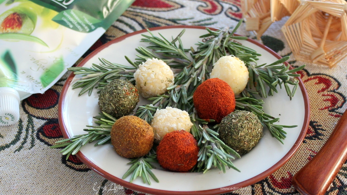 Шарики — это не что иное, как масса из сыра, яиц и майонеза Оливковый («Слобода»), подкрашенная различными специями.
