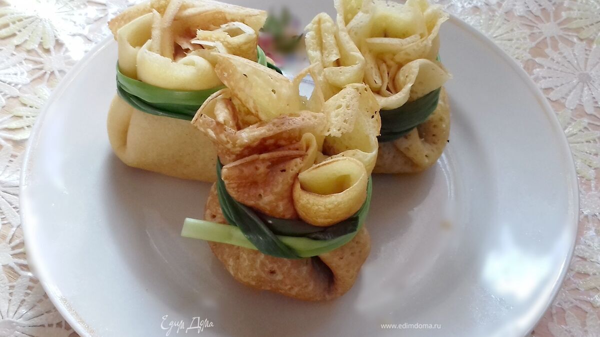 - Шаг 5Делаем мешочки. На середину каждого блинчика кладем по столовой ложке начинки. Сворачиваем в виде мешочка и перевязываем пером зеленого лука. Вкусные они как горячие, так и холодные.