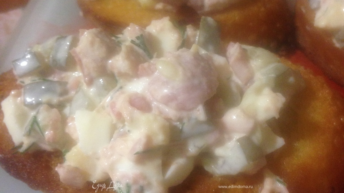 Выкладываем нашу закуску на багет. Его предварительно можно натереть чесноком. Приятного аппетита!
