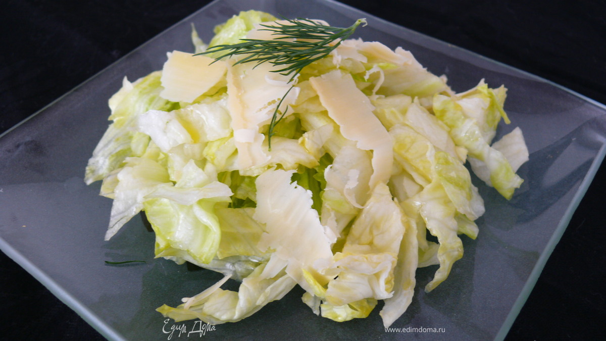 - Шаг 1Порезать айсберг на небольшие кусочки,присолить,заправить оливковым маслом, сбрызнуть лимонным соком. Выложить на тарелку, сверху - тонкие пластинки пармезана.Можно добавить кедровые орешки.