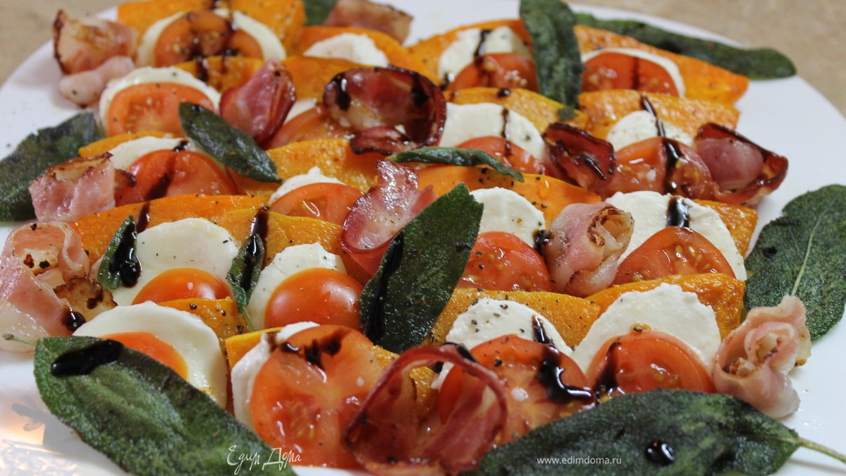 Собираем салат. На блюде выложите чередуя теплую тыкву, на тыкву моцареллу, ломтики помидоров, сдобрите крупной морской солью и молотым перцем. - Шаг 7