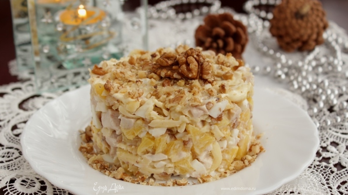 Я слоями такой делаю. намного вкруснее получается и каждый слой немного майонезом промазать надо. а орехи на мелкой терке сверху потереть и можно еще орехи выложить по кругу салата. смотрится лучше и праздничнее. 5 лет такой салат делаю.
