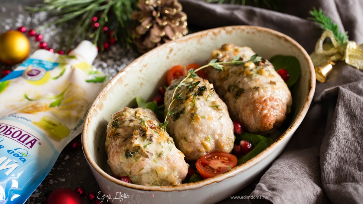 Идея мясного рулета далеко не нова и в общем это весьма простой способ сделать еду красивее, вкуснее и нежнее. Можно взять любую часть мяса (корейка, шейка, вырезка, пашина, окорок) и комбинировать разные вкусы, ингредиенты — получится очень хорошо. А майонез «Слобода» всегда поможет нам сделать начинку вкуснее и ярче.