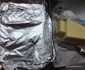 Разогреваем духовку до 210°С. Готовим форму для запекания: ее удобно выстелить фольгой в два слоя, чтобы потом не мучиться и не отмывать, сейчас поймете почему. Растапливаем до жидкого состояния сливочное масло. Две трети выливаем прямо в форму, распределяем равномерно. А треть оставляем в мисочке. Будем макать туда курицу.