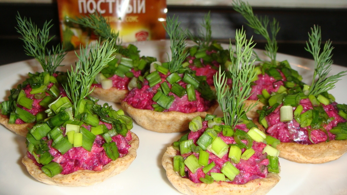 Тарталетки сверху посыпать луком и украсить веточкой укропа. Яркое и праздничное блюдо готово. Приятного аппетита !
