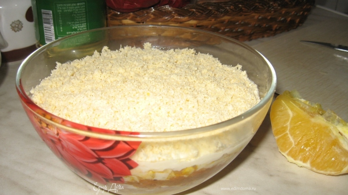 - Майонез, апельсин, мясо, морковь, яйца, сыр