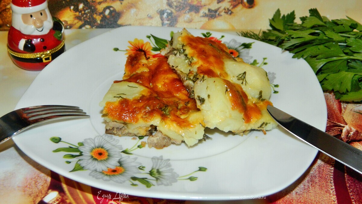 На противень выложить мясо, затем картофель, сверху посыпать сыром. Запекать в разогретой до 180°С духовке 40 минут.