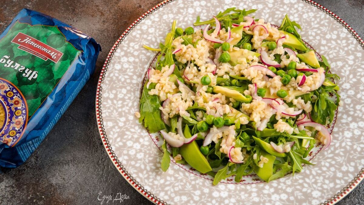 На блюдо выложить руколу, посолить, полить оставшимся лимонным соком и оливковым маслом, затем поперчить. Сверху разложить авокадо, булгур и зеленый горошек. - Шаг 8