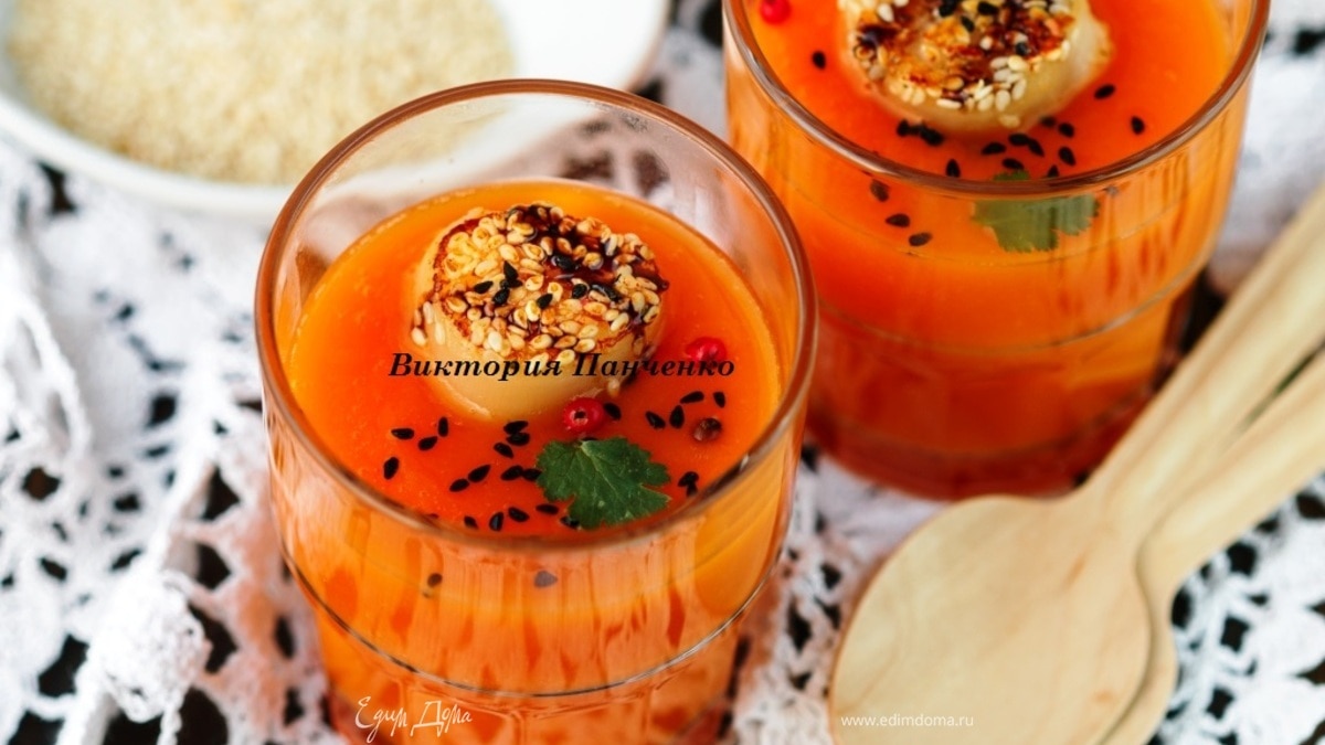 Морские гребешки разморозить. Желательно это сделать на верхней полке холодильника в течение 1,5 — 2 часов. Лишнюю воду слить. В небольшую чашку насыпать кунжут. Разогреть сковороду, налить масло. Каждый гребешок обмакнуть в кунжут и обжарить по 30 секунд каждую сторону. Готовые гребешки приправить солью и перцем, сбрызнуть лимонным соком. - Шаг 4В порционные стаканы разлить суп, добавить обжаренные гребешки, украсить петрушкой, кунжутом и розовым перцем (по желанию). Приятного аппетита!