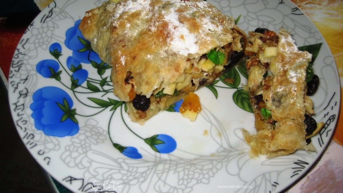 - Шаг 1Тесто тонко раскатать,на него слоями выложить: порубленные орехи,порезанную курагу,изюм,порезанное на мелкие кубики очищенное от кожуры яблоко,и порезанный мармелад,сверху посыпать сахаром. Аккуратно свернуть в рулет,поверх смазать оливковым маслом и выпекать в духовке до золотистой корочки! Готовый штрудель можно посыпать сахарной пудрой,но он и так очень сладкий! Подавать его остывшим,не горячим...Приятного аппетита!