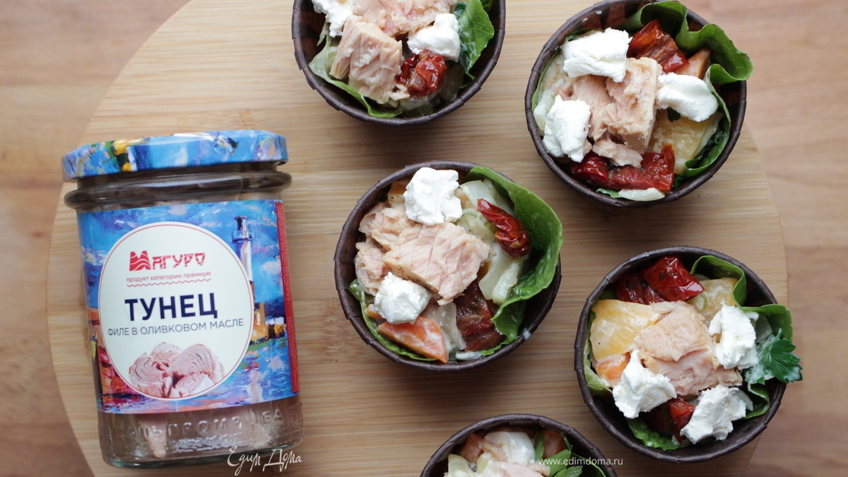 На листья салата выкладываем смесь кореньев со сливками, затем брынзу кусочками, вяленые томаты и сверху выкладываем кусочки тунца. Поливаем соком с маслом из баночки. Приятного аппетита!