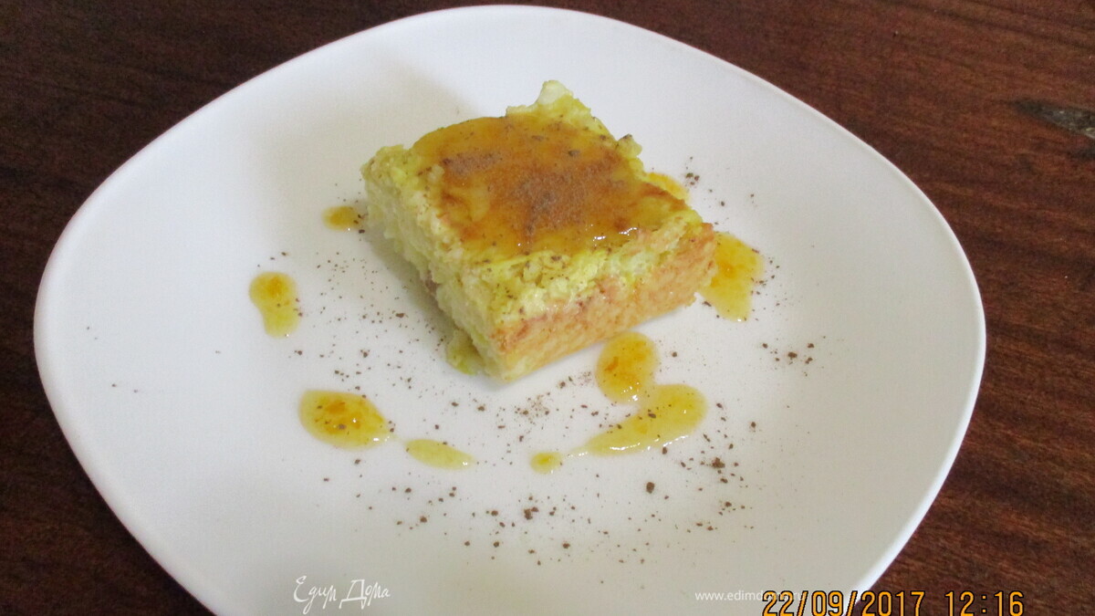 - Шаг 5Каша готова, немного остынет, лопаткой выкладываем на тарелку, поливаем персиковым повидлом и посыпаем молотой корицей.