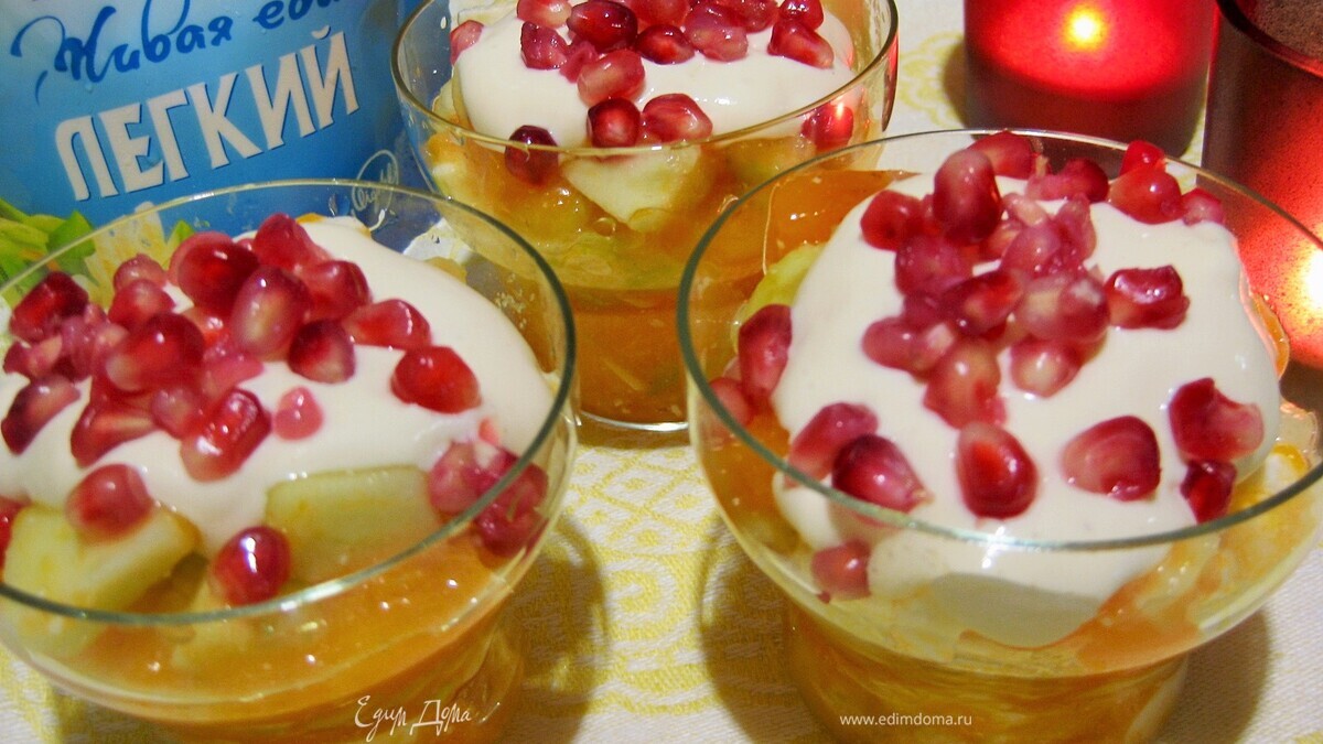 Разложить салат по вазочкам, сверху полить майонезом ТМ «Слобода» Легкий. Посыпать зернами граната. Салат готов! Особенно хорош, когда постоит пару часов.