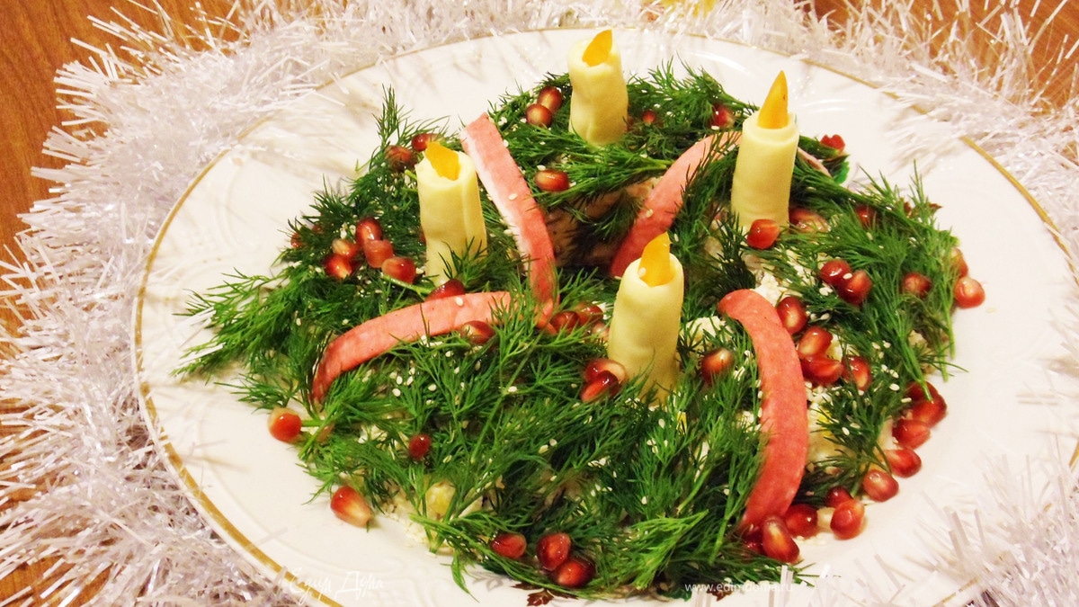 Классический салат из крабовых палочек, наряду с оливье, давно стал традиционным кушаньем на праздничном застолье. Рецепт крабового салата наверняка знает каждый. Понадобятся сами палочки, вареные яйца, консервированная кукуруза и майонез — весьма скромный набор продуктов. Со временем появилось множество рецептов, где главным ингредиентом являются крабовые палочки. В состав предлагаемого салата «Рождественский» входит морская капуста, которая добавит интересные нотки. Вкус морепродуктов хорошо оттенит майонез «Слобода» с лимонным соком. Оформление в новогоднем стиле.