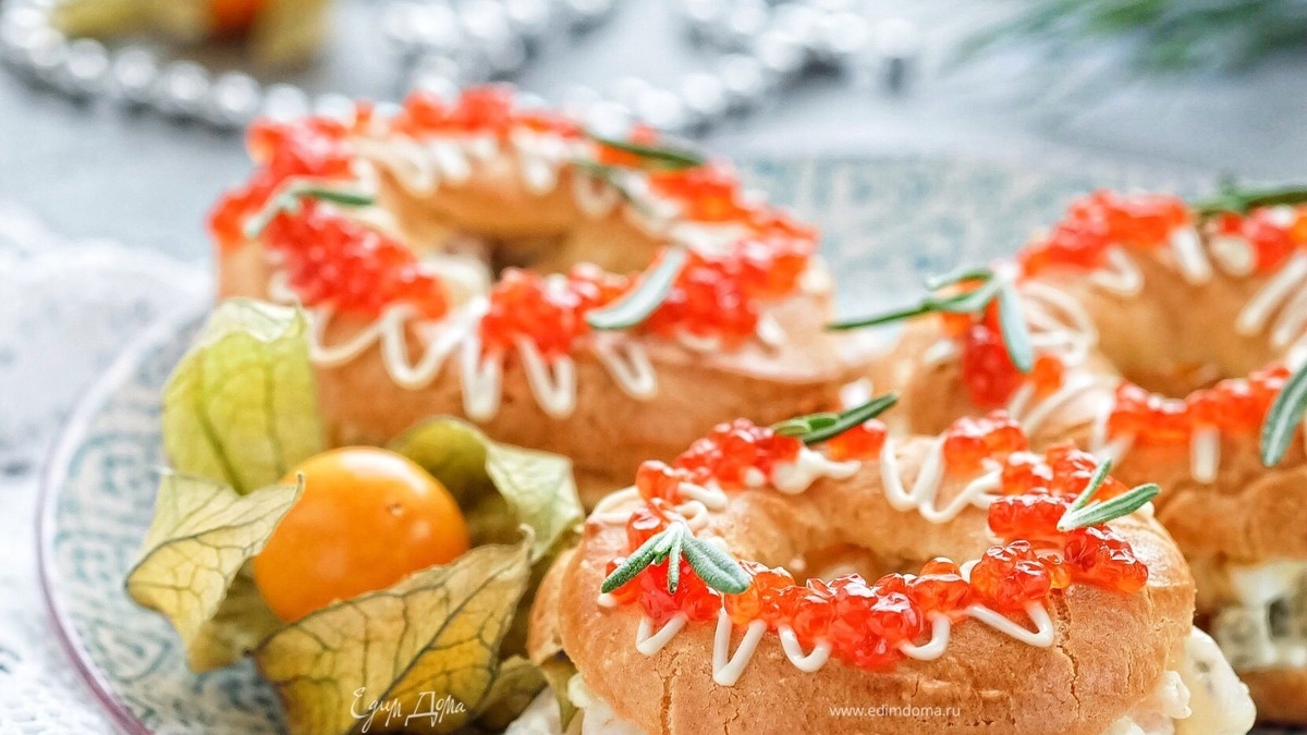 Я очень люблю заварное тесто! Но оно прекрасно не только для эклеров и профитролей. Можно, например, испечь кольца, нафаршировать их салатом и подать. Это будет не только оригинально, красиво и празднично, но и очень вкусно.