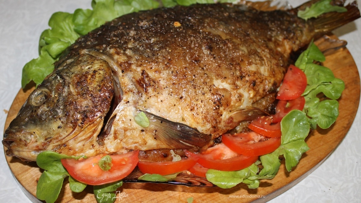 Готового карпа переложите на блюдо, украсьте нарезанными помидорами, зеленью и подавайте к столу. Приятного аппетита и добрых традиций.