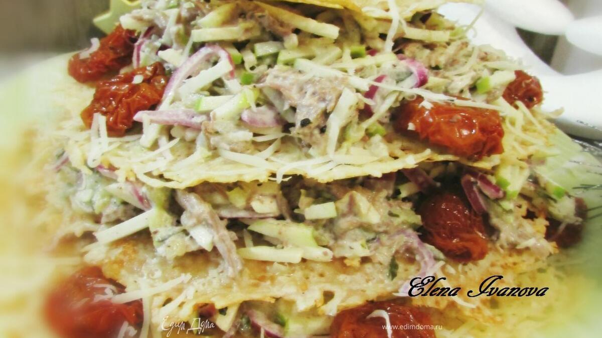 Накрыть его сырной тарелкой большего диаметра. На нее еще немного салата, затем лепешка чуть меньшего диаметра. Так собрать весь салат.