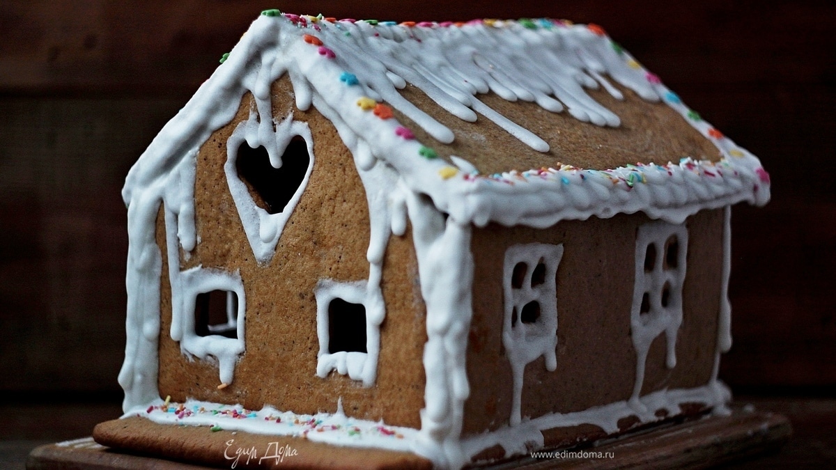 Я готовила его в первый раз и вышел домик слегка неказистый. Надеюсь, у вас получится лучше. Зато тесто идеально — из него получаются отличные «стены» и остается еще и на печенье!