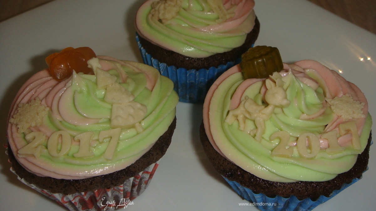 Капкейки остудить, сделать в них отверстия и наполнить сливовым джемом. Переложить крем в кондитерский мешок и украсить капкейки.