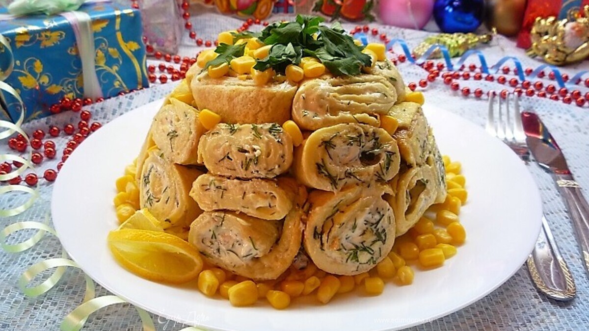 Круглый салатник выстилаем пищевой пленкой, чтобы свисали края. Выкладываем блинные рулетики сначала на дно, потом по бокам. - Шаг 9