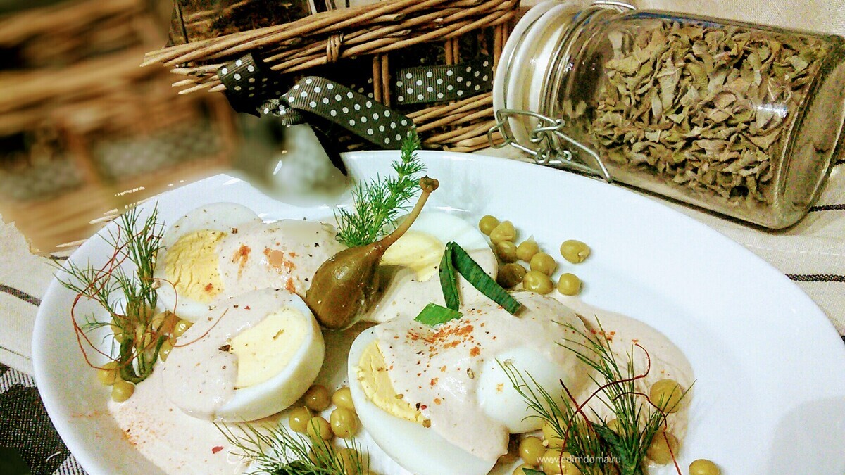 Выложить половинки яиц на блюдо и полить соусом. - Шаг 4