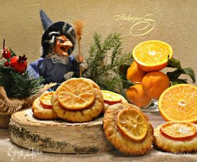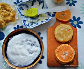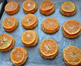 Противень застелите пекарской бумагой и слегка смажьте сливочным маслом. Выложите заготовки на противень, сверху присыпьте сахаром, сверху смажьте белком, выложите кружки мандаринов, слегка прижимая к тесту, и снова присыпьте сахаром. Выпекайте печенье в разогретой духовке до 200°С 20 — 25 мин.