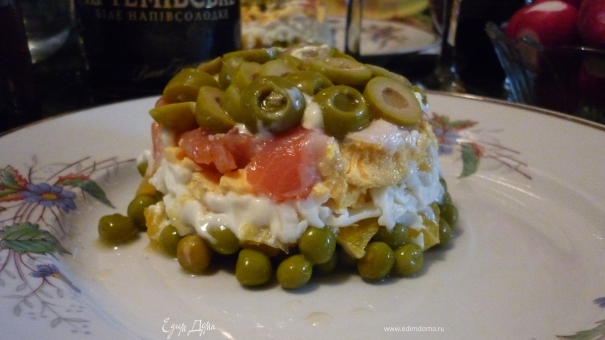 - ПодготовкаЯйца сварить вкрутую, очистить, отделить желтки от белков, нарезать отдельно. Очистить апельсин, нарезать тонкими лепестками. Филе семги нарезать тонкими пластинами. Из банки с зеленым горошком слить жидкость. Выложить салат в пиалы слоями, каждый смазывая майонезом: оливки - семга - желтки - белки - апельсин - зеленый горошек. Каждую пиалу (порцию) перевернуть на отдельную тарелку. Пиалу снять. Украсить по желанию.