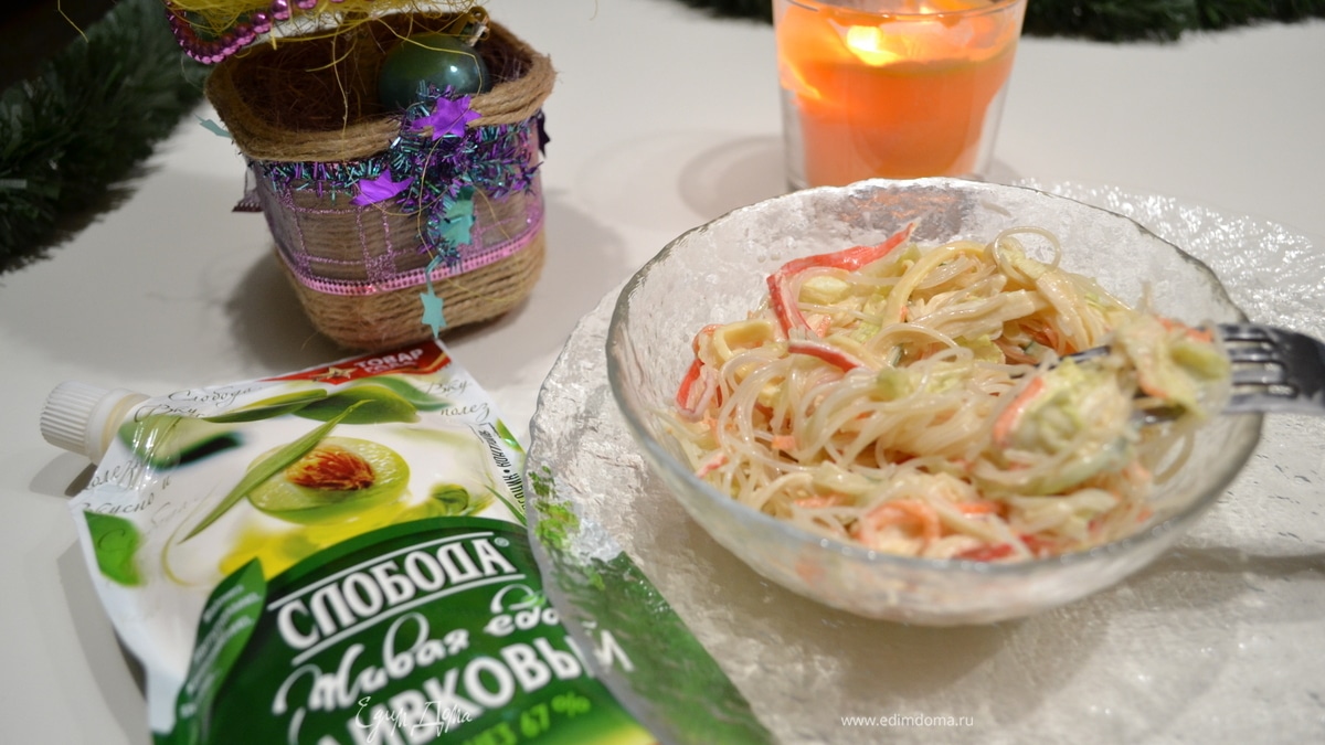 - Шаг 3Приготовить заправку. Для этого смешать майонез ТМ «Слобода» Оливковый, йогурт, соевый соус, специи. Заправить салат. Выложить в порционные салатники и подавать с любовью и хорошим настроением.