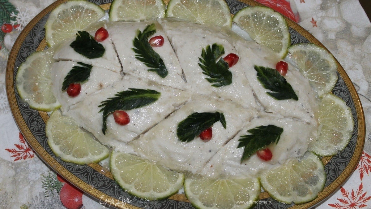 Застывшую рыбную массу нарежьте порционными кусочками и переложите на сервировочное блюдо с застывшим бульоном. Нарежьте тонкими ломтиками лимон, разложите вокруг рыбы. Сверху налейте немного рыбного бульона, украсьте по своему усмотрению и отправьте в холодильник на 15 минут. - Шаг 9