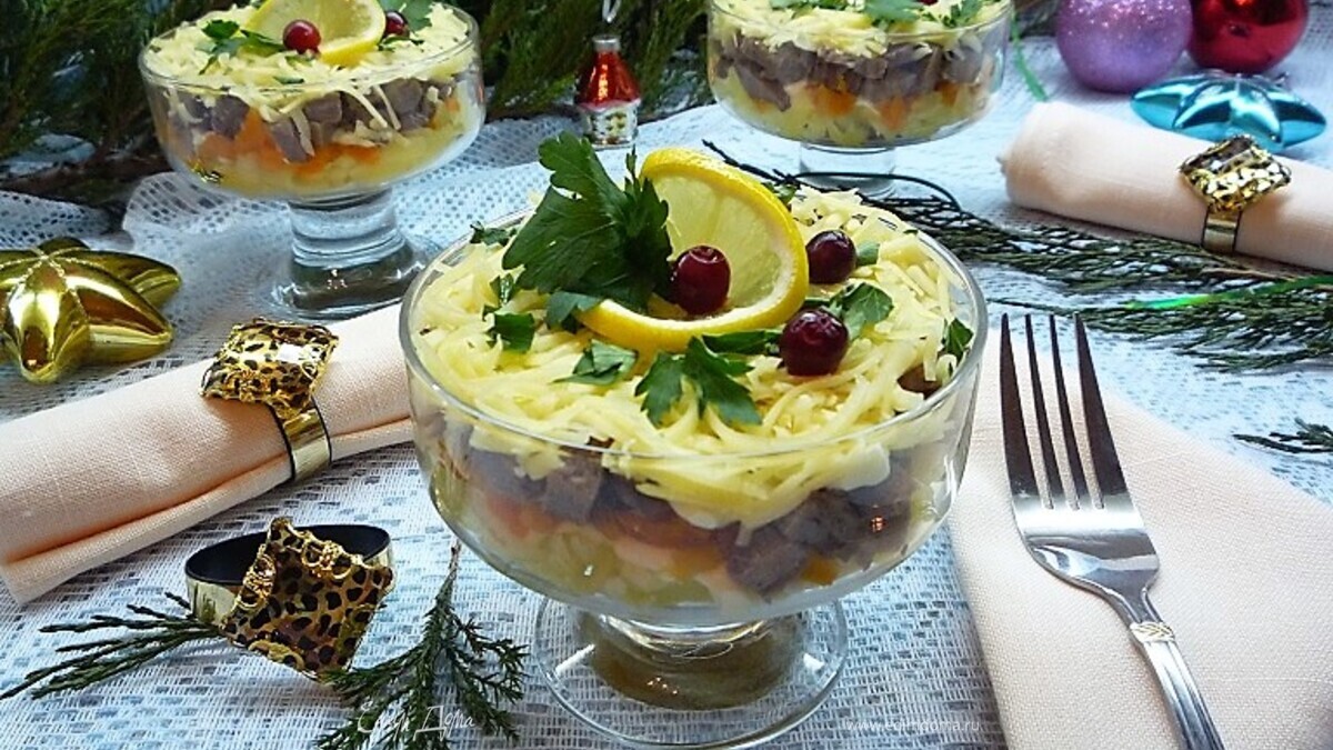 Этот замечательный, нежный, сытный слоеный салат — идеальный к праздничному столу! Не повторимый, пикантный вкус салату придают мускатный орех и майонез ТМ «Слобода» На перепелиных яйцах.