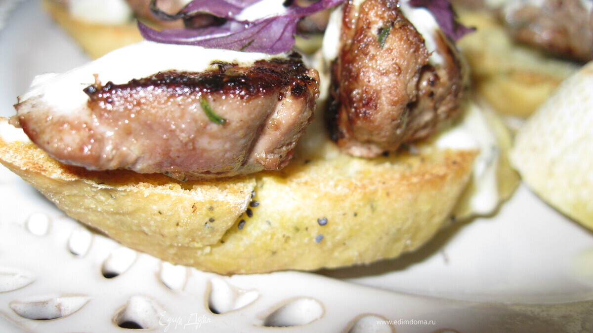 Брускетты с печенью кролика и винным соусом на кукурузном хлебе