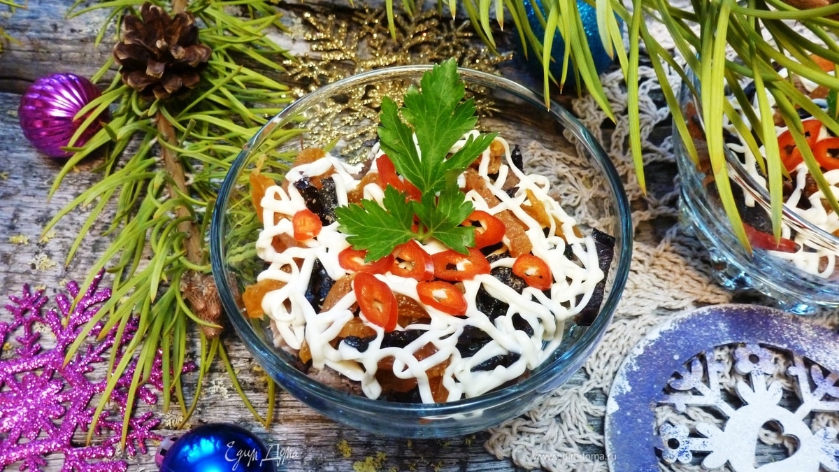 Этот салат довольно сытный и отлично подойдет к крепким напиткам, поэтому он нравится мужчинам. Для него я взяла вареную оленину, а мясо северного оленя считается одним из самых полезных. Сухофрукты и приличное количество свежего перца чили делает его легкоусваиваемым для организма.