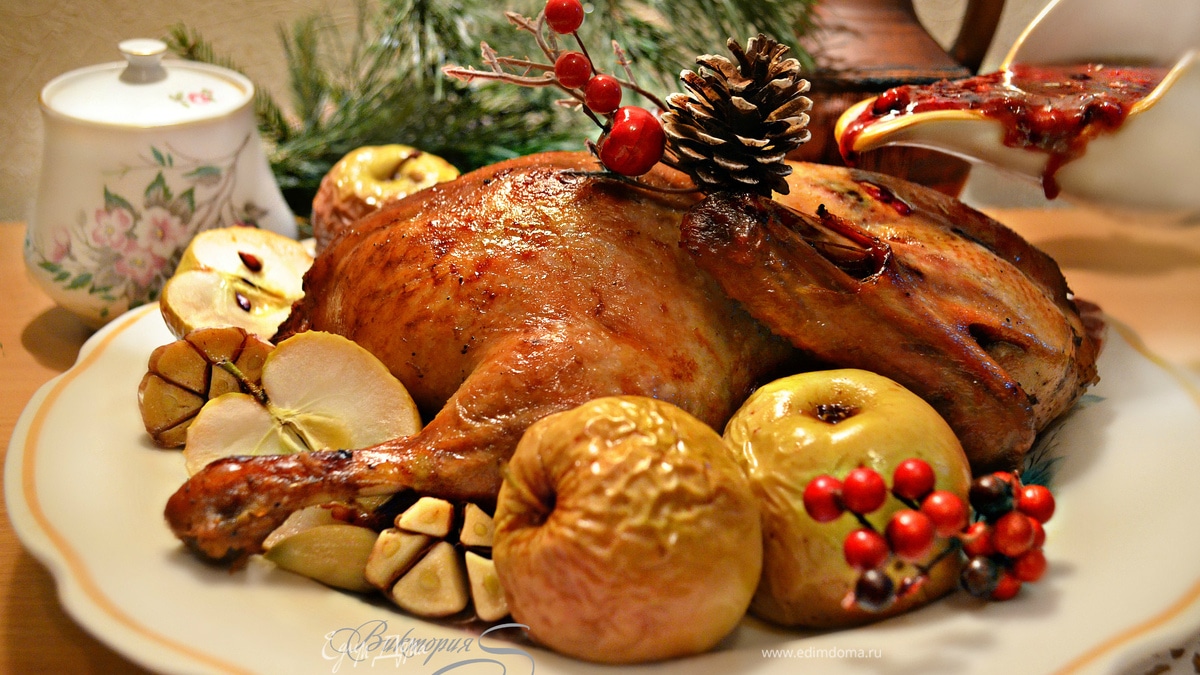 Готовую утку выложите на большое блюдо, вокруг разложите яблоки и чеснок. К этому блюду идеально подойдет запеченный картофель. Не забудьте подать клюквенный соус. «Итак, прошу за стол!» Приятного вам аппетита!