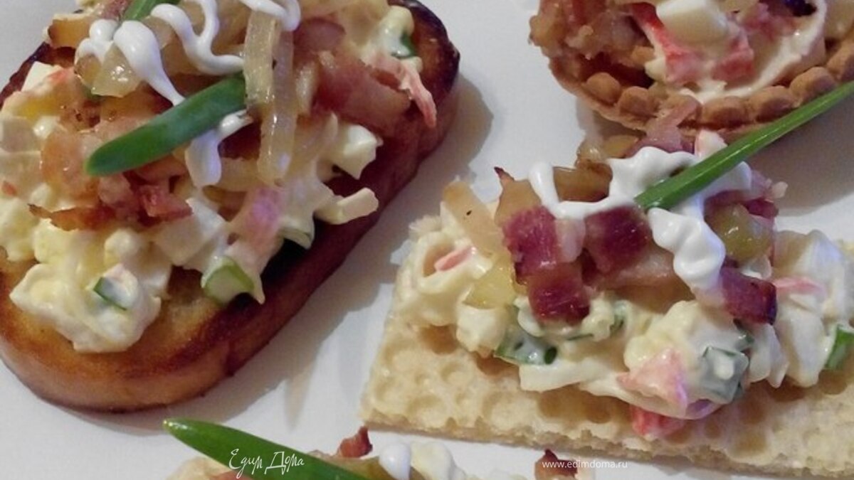 Сверху посыпаем жареным луком и беконом. Хрустящий бекон и лук придадут пикантность нашей закуске. Ну вот и все, приятного аппетита!
