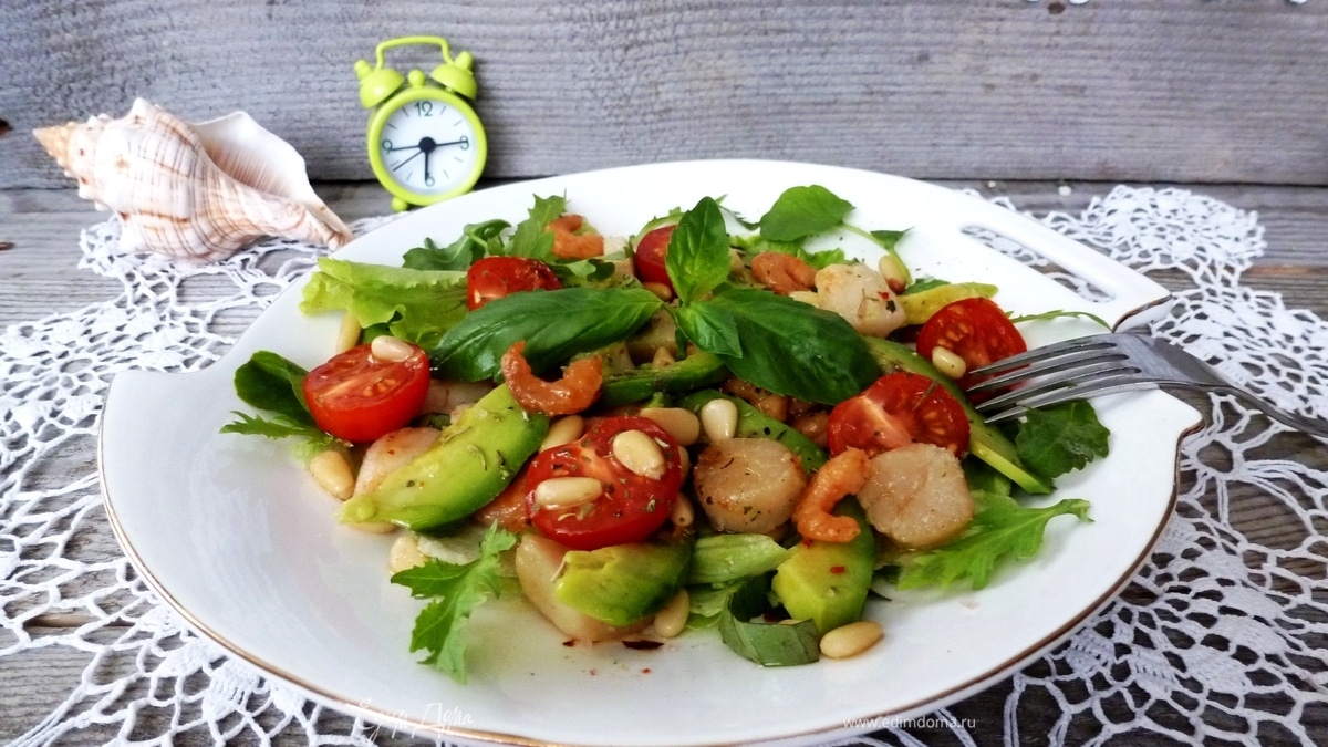 Салат с гребешками, креветками и авокадо